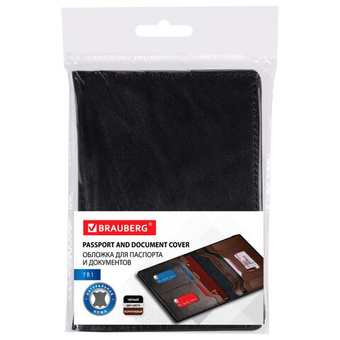 Обложка для паспорта и документов 7 в 1 натуральная кожа, без тиснения, черная, BRAUBERG, 238196