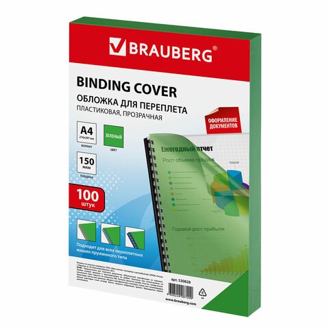 Обложки пластиковые для переплета, А4, КОМПЛЕКТ 100 шт., 150 мкм, прозрачно-зеленые, BRAUBERG, 530828
