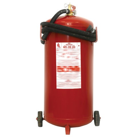 ОП-35 относится к классу передвижных огнетушителей. Конструкция предусматривает передвижение огнетушителя при помощи прикрепленных к его корпусу колес. Используется при тушении пожаров класса АВСЕ.