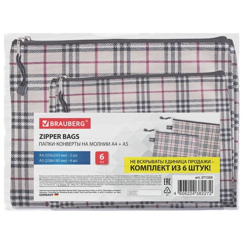 Папка-конверт СУПЕР КОМПЛЕКТ на молнии, 6 штук (А4 - 2 шт., А5 - 4 шт.), ткань в клетку, BRAUBERG, 271350