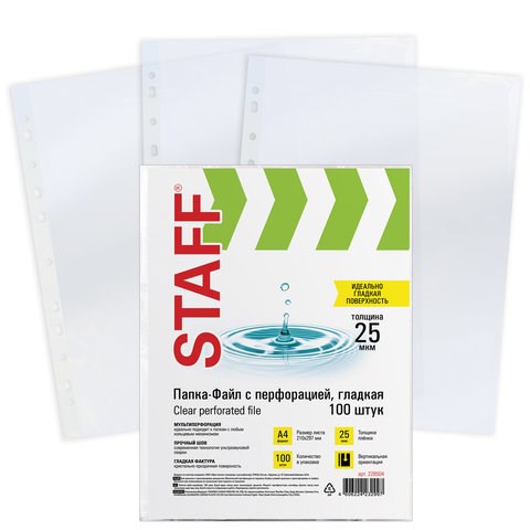 Перфорированные папки-файлы STAFF "ЭКОНОМ" служат для подшивки документов в папки с любым кольцевым механизмом и скоросшивателем. Они находят свое практическое применение в любом учреждении, предприятии, офисе, фирме.