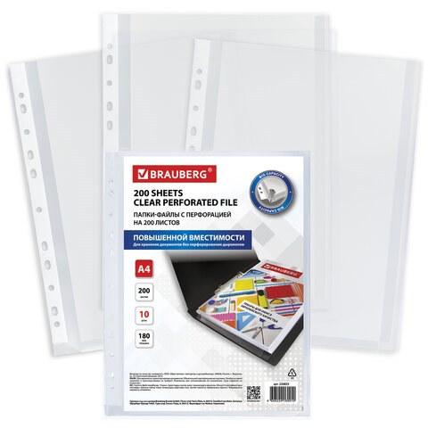 Папки-файлы перфорированные БОЛЬШОЙ ВМЕСТИМОСТИ до 200 листов, А4, КОМПЛЕКТ 10 шт., 180 мкм, BRAUBERG, 226833