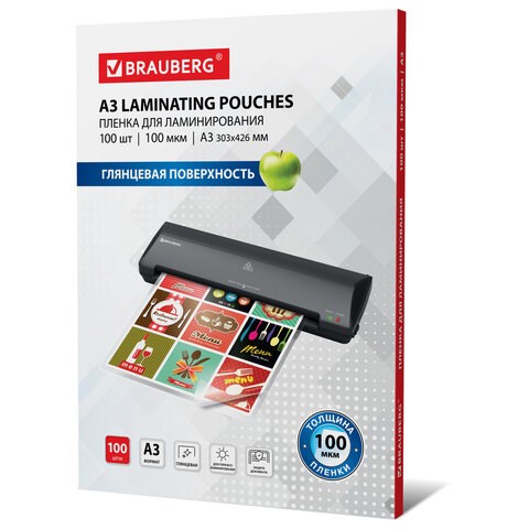 Пленки-заготовки для ламинирования БОЛЬШОГО ФОРМАТА, А3, КОМПЛЕКТ 100 шт., 100 мкм, BRAUBERG, 530895
