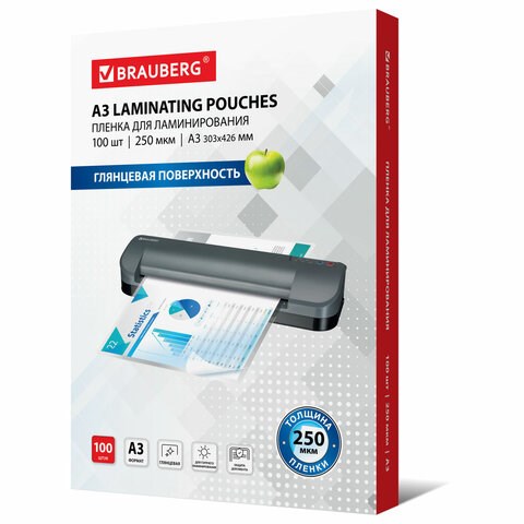 Пленки-заготовки для ламинирования БОЛЬШОГО ФОРМАТА, А3, КОМПЛЕКТ 100 шт., 250 мкм, BRAUBERG, 531779