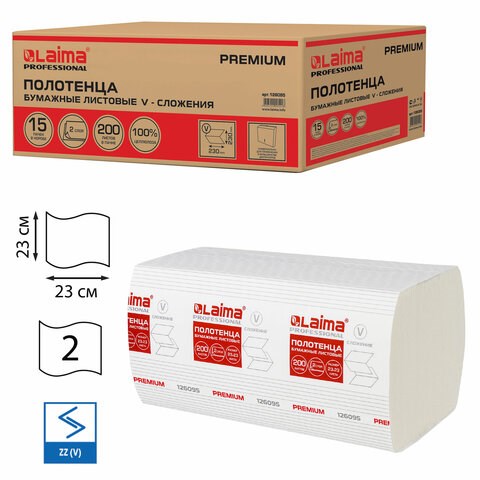 Полотенца бумажные 200 штук, LAIMA (H3) PREMIUM, 2-слойные, белые, КОМПЛЕКТ 15 пачек, 23х23, V-сложение, 126095