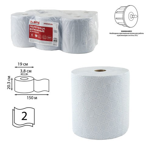 Полотенца бумажные рулонные 150 м, LAIMA (Система H1) PREMIUM, 2-слойные, белые с ЦВЕТНЫМ ТИСНЕНИЕМ, КОМПЛЕКТ 6 рулонов, 112504