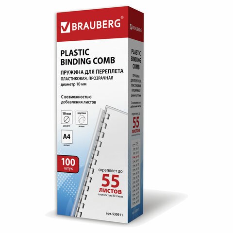 Пружины пластиковые для переплета, КОМПЛЕКТ 100 шт., 10 мм (для сшивания 41-55 л.), прозрачные, BRAUBERG, 530911