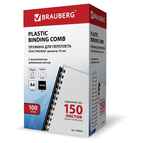 Пружины пластиковые для переплета, КОМПЛЕКТ 100 шт., 19 мм (для сшивания 121-150 л.), черные, BRAUBERG, 530924