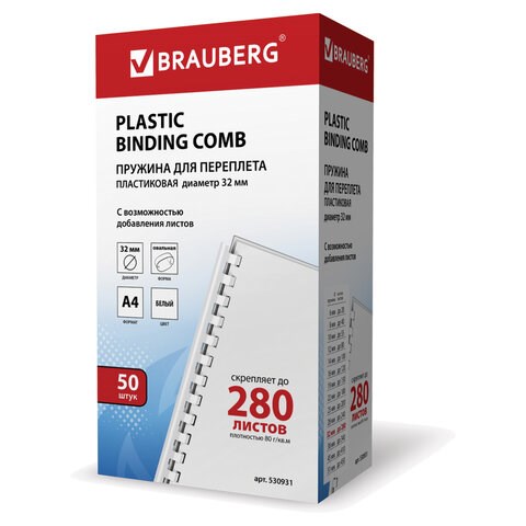 Пружины пластиковые для переплета, КОМПЛЕКТ 50 шт., 32 мм (для сшивания 241-280 л.), белые, BRAUBERG, 530931