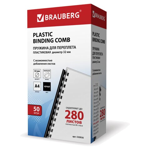 Пружины пластиковые для переплета, КОМПЛЕКТ 50 шт., 32 мм (для сшивания 241-280 л.), черные, BRAUBERG, 530930