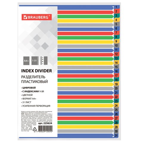 Разделитель пластиковый широкий BRAUBERG А4+, 31 лист, цифровой 1-31, оглавление, цветной, 225624
