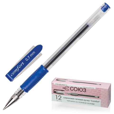 Ручка гелевая с грипом СОЮЗ "Comfort", СИНЯЯ, корпус прозрачный, узел 0,7 мм, линия письма 0,4 мм, РГ 166-01