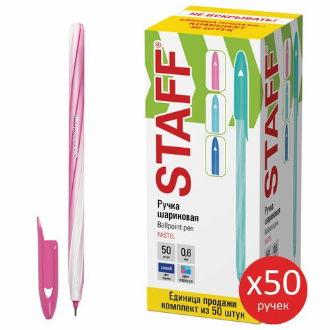 Ручка шариковая STAFF "CANDY PASTEL", синяя, ВЫГОДНЫЙ КОМПЛЕКТ 50 шт., узел 0,6 мм, линия 0,3 мм, 144238