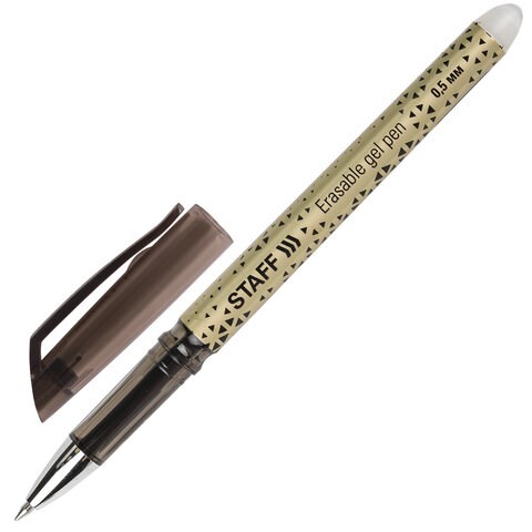 Стираемая ручка STAFF пишет специальными гелевыми чернилами, которые становятся невидимыми при нагревании до 60 °С и выше. Нагрев достигается ластиком, встроенным в корпус ручки. Написанное можно восстановить при температуре ниже –18 °С.