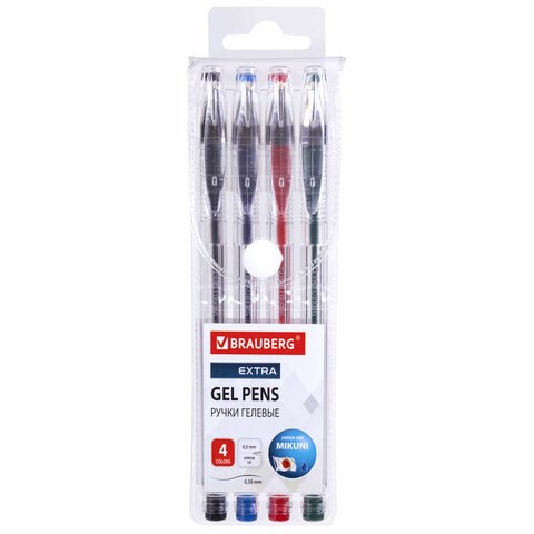 Ручки гелевые BRAUBERG "EXTRA", НАБОР 4 ЦВЕТА, узел 0,5 мм, линия 0,35 мм, 143905