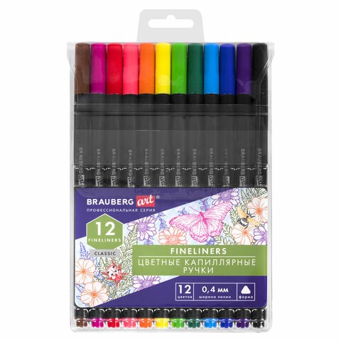 Ручки капиллярные (линеры), 12 ЦВЕТОВ, BRAUBERG ART, "Classic", трехгранные, металлический наконечник, линия письма 0,4 мм, 144147