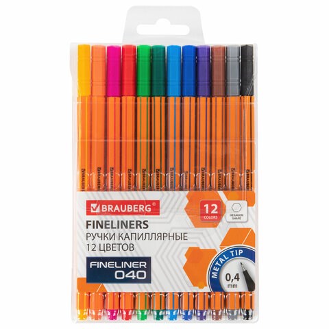 Ручки капиллярные (линеры) 12 ЦВЕТОВ, BRAUBERG "FINE 040", шестигранные, линия 0,4 мм, 144143