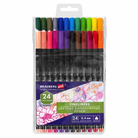 Ручки капиллярные (линеры), 24 ЦВЕТА, BRAUBERG ART "Classic", трехгранные, металлический наконечник, линия письма 0,4 мм, 144148