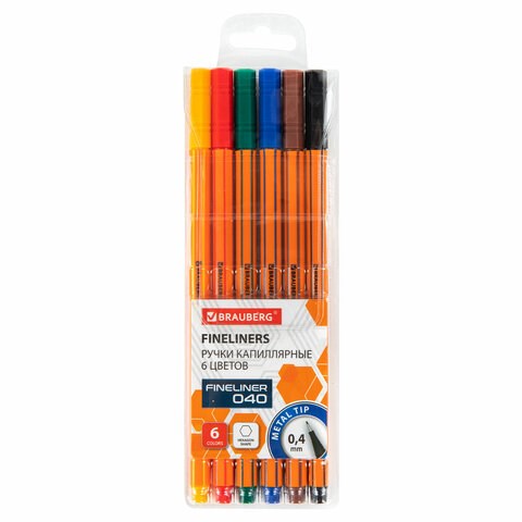 Ручки капиллярные (линеры) 6 ЦВЕТОВ, BRAUBERG "FINE 040", шестигранные, линия 0,4 мм, 144141