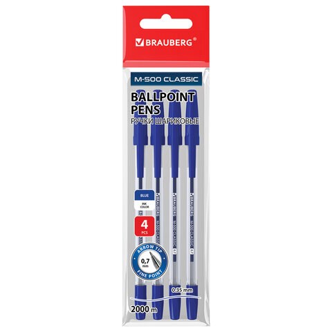Ручки шариковые BRAUBERG "M-500 CLASSIC", НАБОР 4 шт., СИНИЕ, узел 0,7 мм, линия письма 0,35 мм, 143453