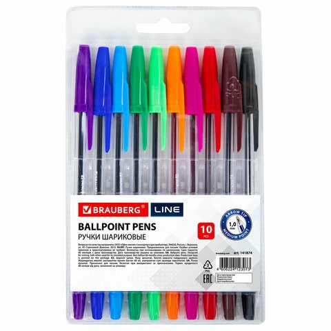Ручки шариковые BRAUBERG, НАБОР 10 шт., АССОРТИ, "Line", корпус прозрачный, узел 1 мм, линия письма 0,5 мм, 141874