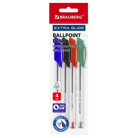 Ручки шариковые масляные BRAUBERG, НАБОР 4 шт., АССОРТИ, "Extra Glide", узел 1 мм, линия письма 0,5 мм, 142138