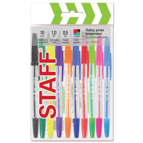Ручки шариковые STAFF "C-51", НАБОР 10 шт., АССОРТИ, узел 1 мм, линия письма 0,5 мм, 142818