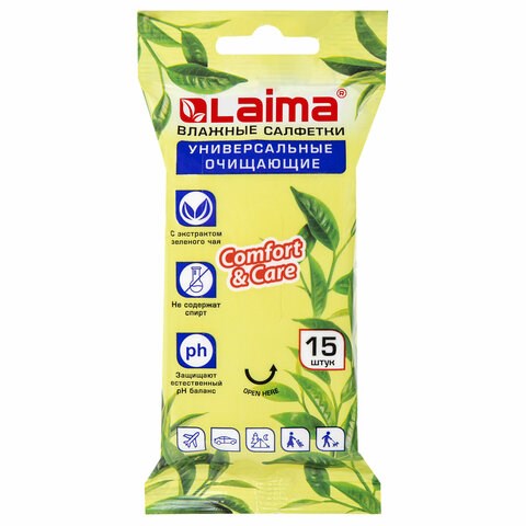 Салфетки влажные 15 шт., УНИВЕРСАЛЬНЫЕ, очищающие, с экстрактом зеленого чая, LAIMA, 125956