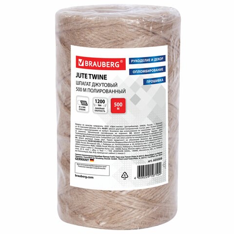 Шпагат джутовый упаковочный полированный, длина 500 м, диаметр 1,5 мм, 1200 текс, BRAUBERG, 605008