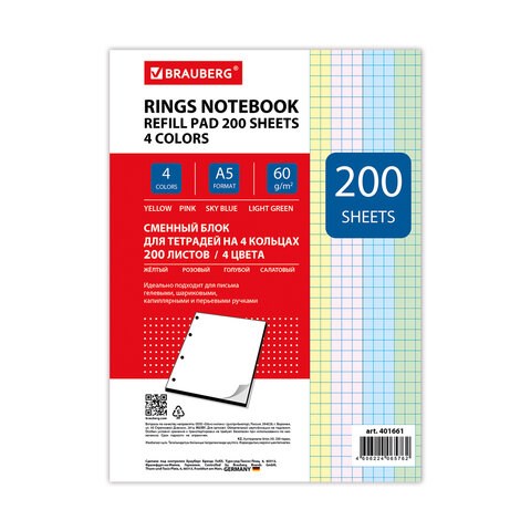 Сменный блок для тетради на кольцах, А5, 200 л., BRAUBERG, 4 цвета по 50 листов, 401661