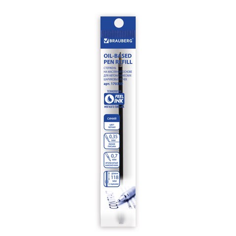 Стержень шариковый масляный BRAUBERG 118 мм, СИНИЙ, с ушками, узел 0,7 мм, линия письма 0,35 мм, 170359