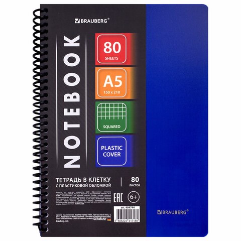 Тетрадь А5 80 л. BRAUBERG "Metropolis", спираль пластиковая, клетка, обложка пластик, СИНИЙ, 404744