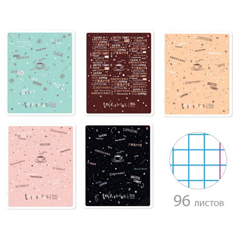 Тетрадь А5 96 л. АЛЬТ скоба, клетка, гибридный лак, "Coffe time" (5 видов), 7-96-1160