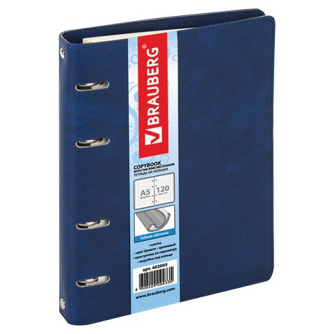 Тетрадь на кольцах А5 (180х220 мм), 120 листов, под кожу, клетка, BRAUBERG "Main", синий, 402005