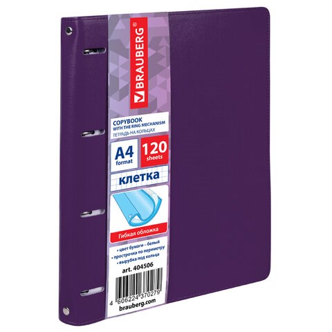 Тетрадь на кольцах БОЛЬШАЯ А4 (240х310 мм), 120 листов, под кожу, клетка, BRAUBERG "Joy", фиолетовый/светло-фиолетовый, 404506