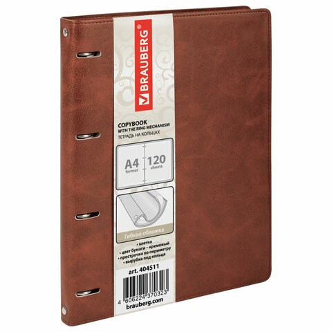 Тетрадь на кольцах БОЛЬШАЯ А4 (240х310 мм), 120 листов, под кожу, клетка, BRAUBERG "Main", коричневый, 404511