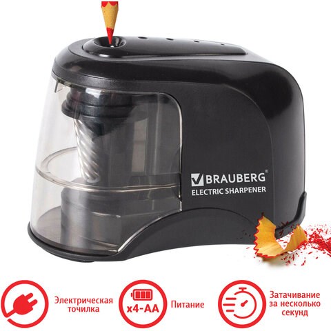 Электрическая точилка со съемным контейнером для сбора мусора и стальным спиралевидным лезвием, работает от 4 батареек АА (в комплект не входят). Предназначена для затачивания деревянных и пластиковых карандашей диаметром 6-8 мм.