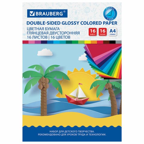 Цветная бумага А4 2-сторонняя мелованная, 16 л., 16 цветов, на скобе, BRAUBERG, 200х280 мм, "Кораблик", 111327