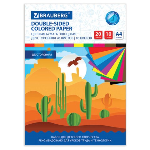Цветная бумага А4 2-сторонняя мелованная, 20 листов 10 цветов, в папке, BRAUBERG, 200х280 мм, "Кактусы", 115171