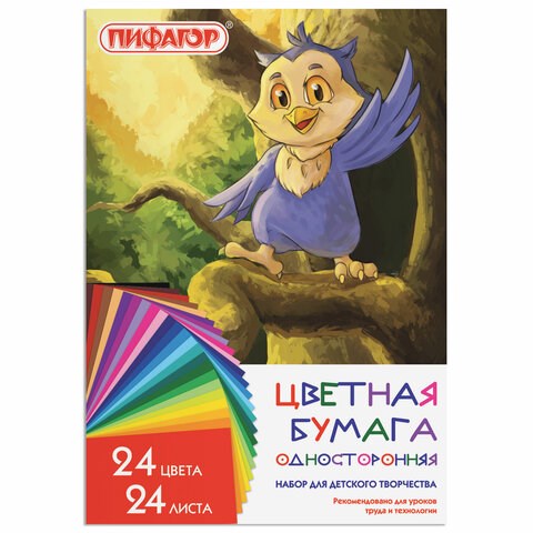 Цветная бумага А4 газетная, 24 листа, 24 цвета, на скобе, ПИФАГОР, 200х283 мм, "Совенок", 128003