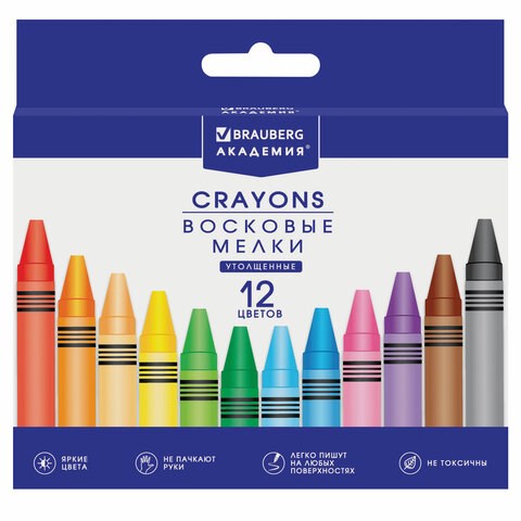 Восковые мелки трехгранные утолщенные BRAUBERG "АКАДЕМИЯ", НАБОР 12 цветов, 227287